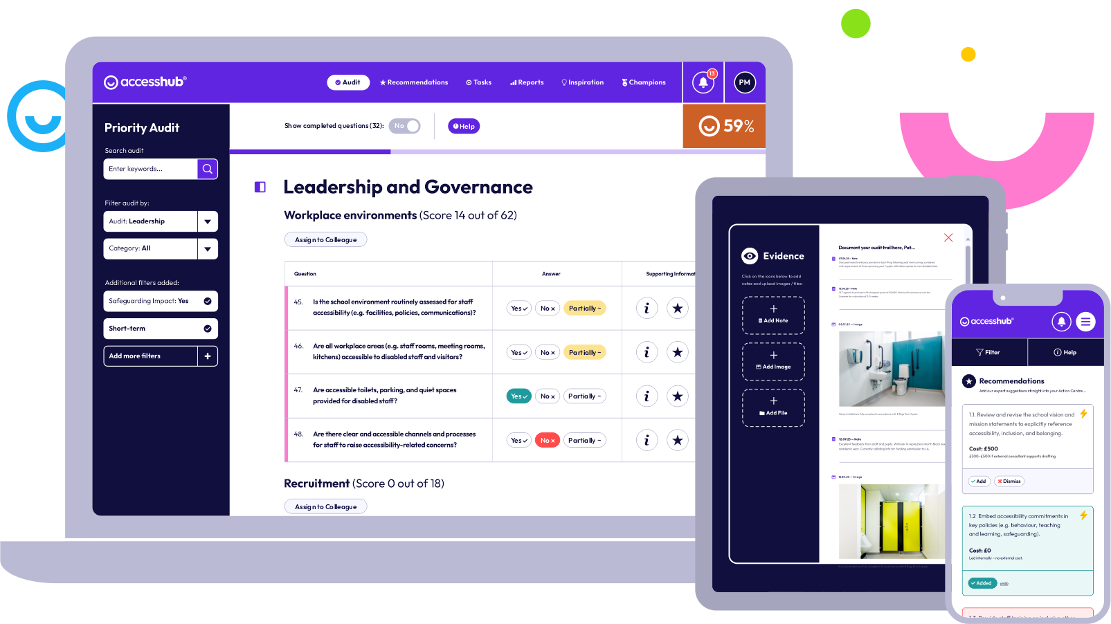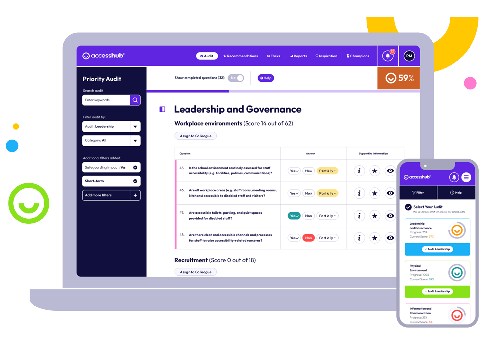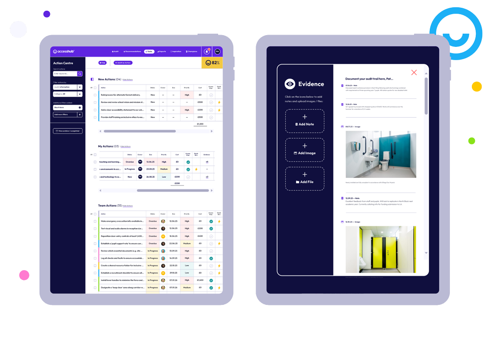 AccessHub brings every aspect of accessibility into one place. Built on a standardised framework, it combines audits, recommendations, reporting, and collaboration — giving schools and trusts a consistent, structured way to plan and improve accessibility.