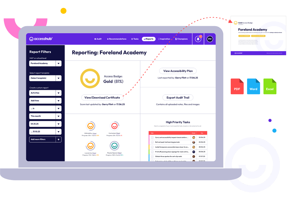 AccessHub isn’t a compliance checklist. It helps schools reflect honestly, plan the right next steps, and demonstrate progress to their whole community. Achievements are recognised through bronze, silver, and gold Access Badges, awarded using our proprietary Welcometer™ scoring methodology.